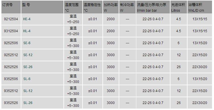 HE / SE / HL / SL共有的特点:* 温度范围:室温+5~300℃;显示分辨率:0.01℃* 适合于浴槽内外的温度控制,尤其适合外部体系的温度控制与测量,外部体系可以是封闭或者开放的体系* 标配内置冷却环* 内置温度控制程序,可以进行自动温度控制HL / SL系列特有的特点:* HL和SL型除具有HE、SE全部特点外,另具有清晰的液晶显示屏,方便使用者操作,可实时显示温度—时间程序运行状态* 内置6profiles×60steps温度控制程序,可以进行自动温度控制* RS232 / RS485通讯接口